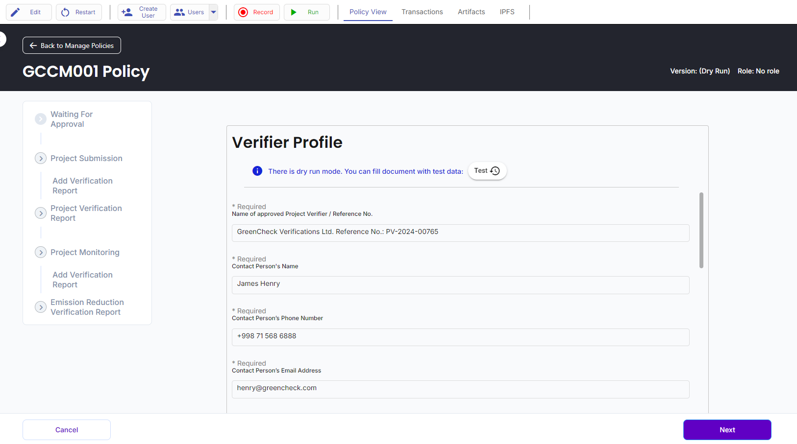 **Verifier:** The Verifier is an independent third-party entity tasked with assessing the emission reduction project’s claims. Their form collects detailed information about the verifying organization, including its credentials, contact details, and the qualifications of the personnel conducting the verification.