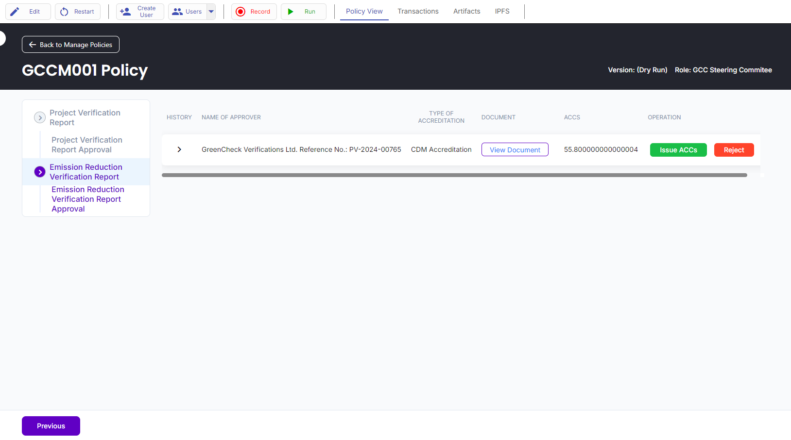 20. Log in as the steering committee to review the emission reduction verification report and issue ACCs if all the information aligns with the approval.