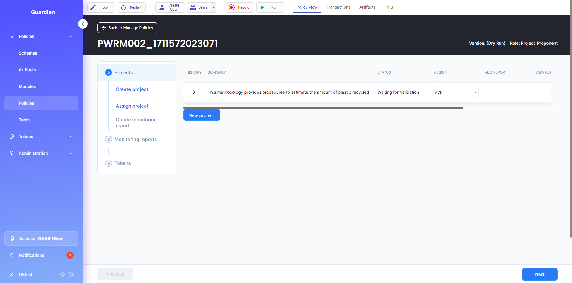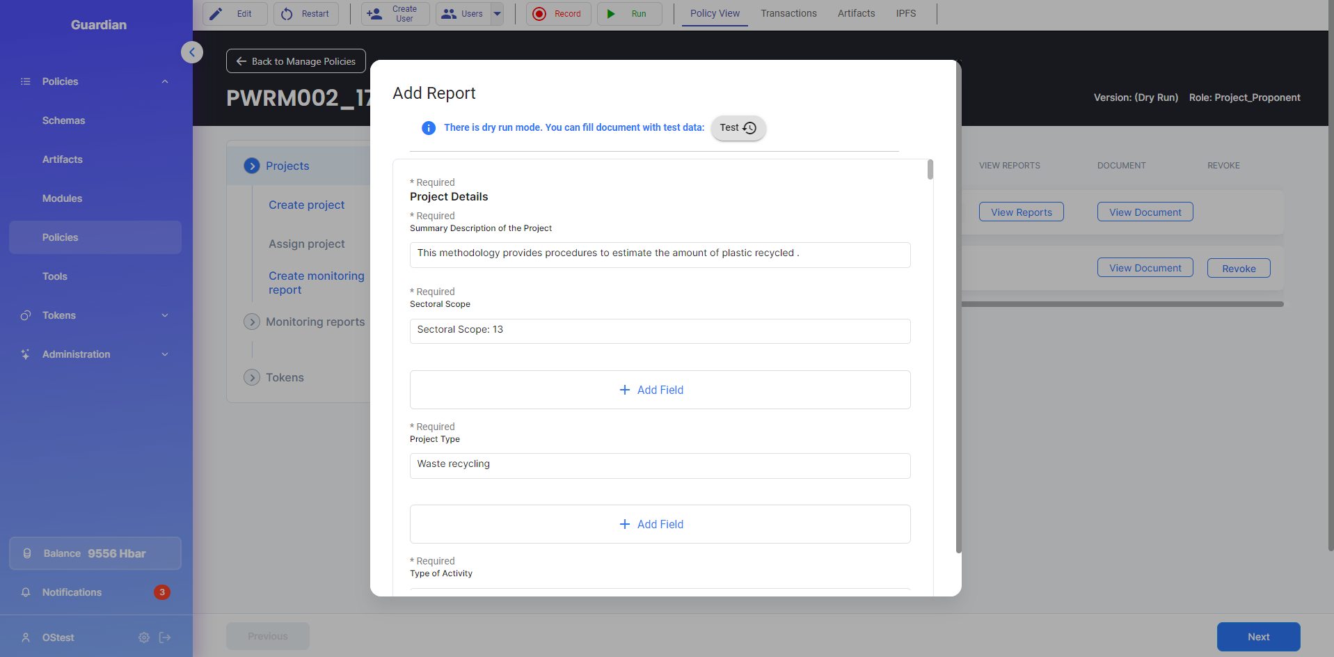 Once validated, we log in as Project Proponent and add a monitoring report.