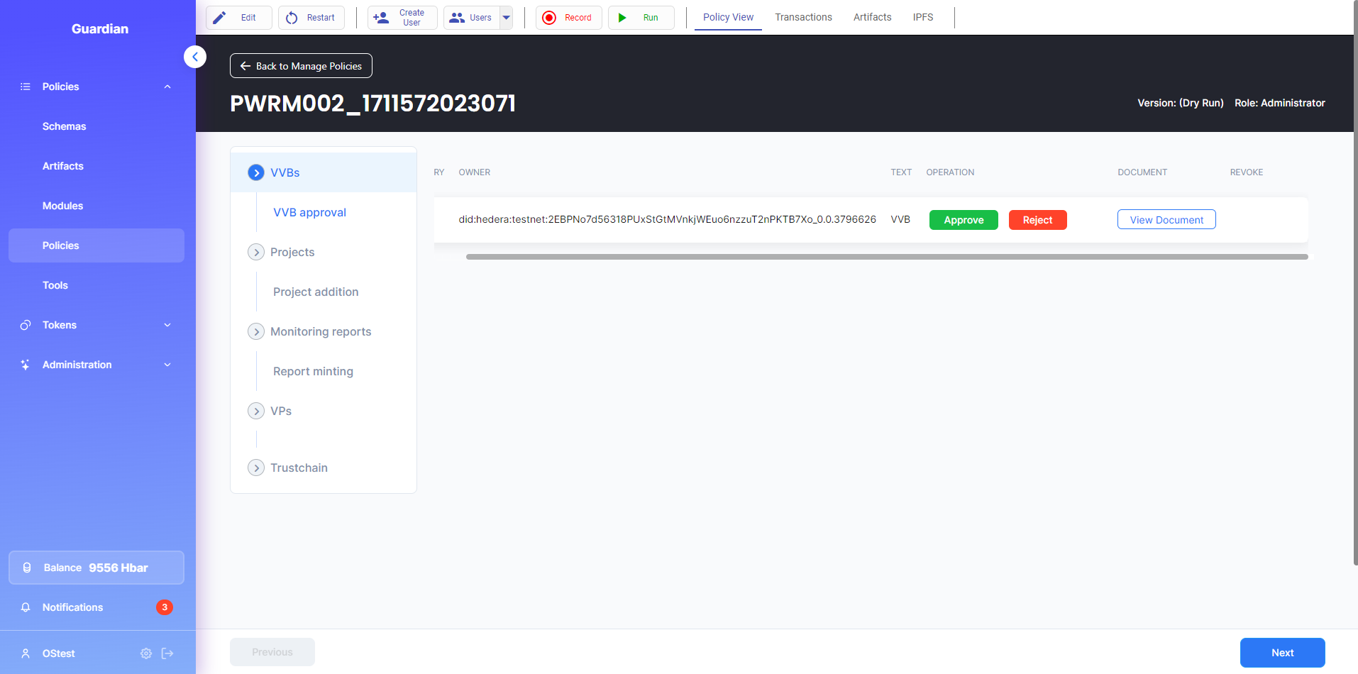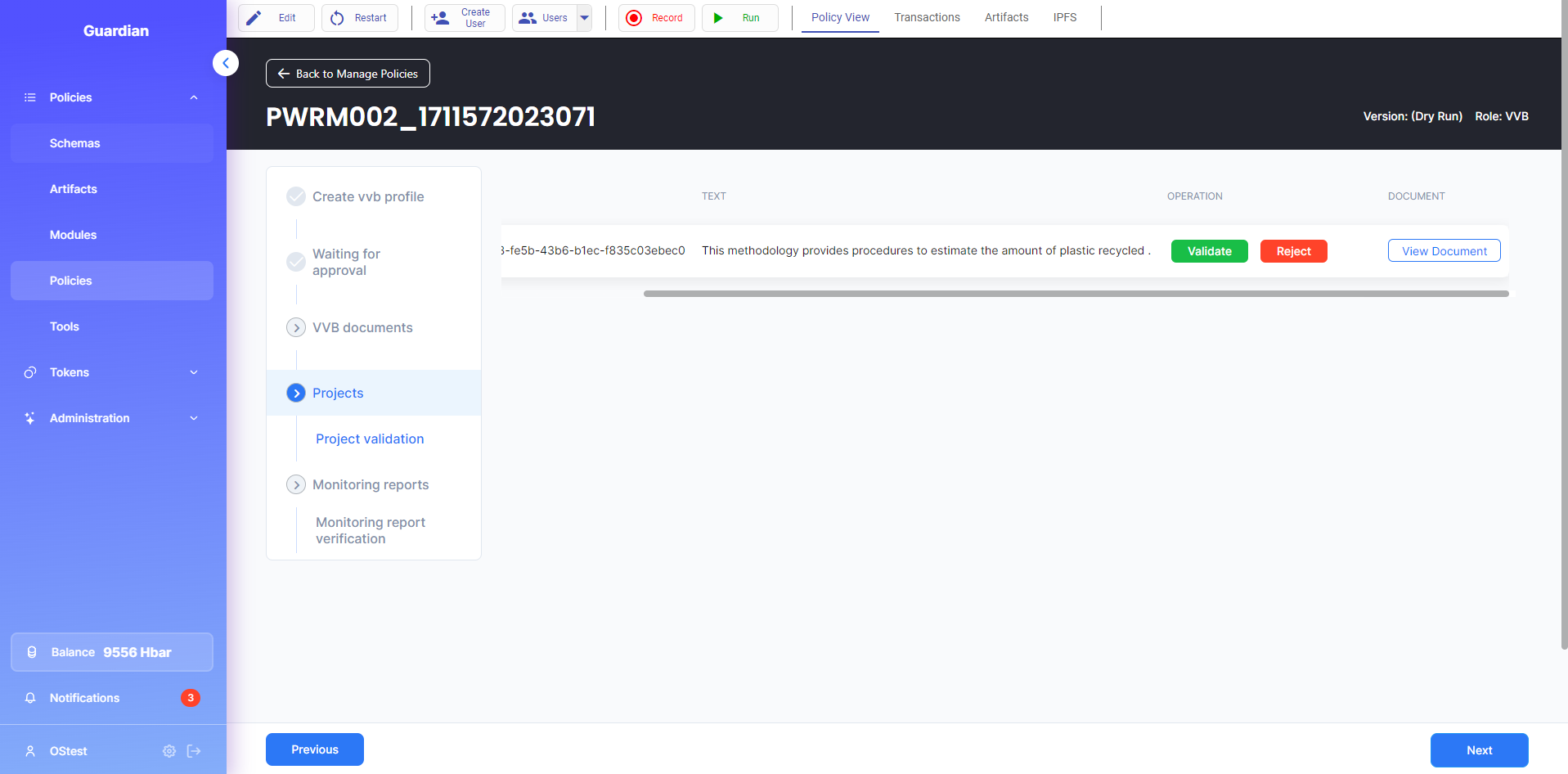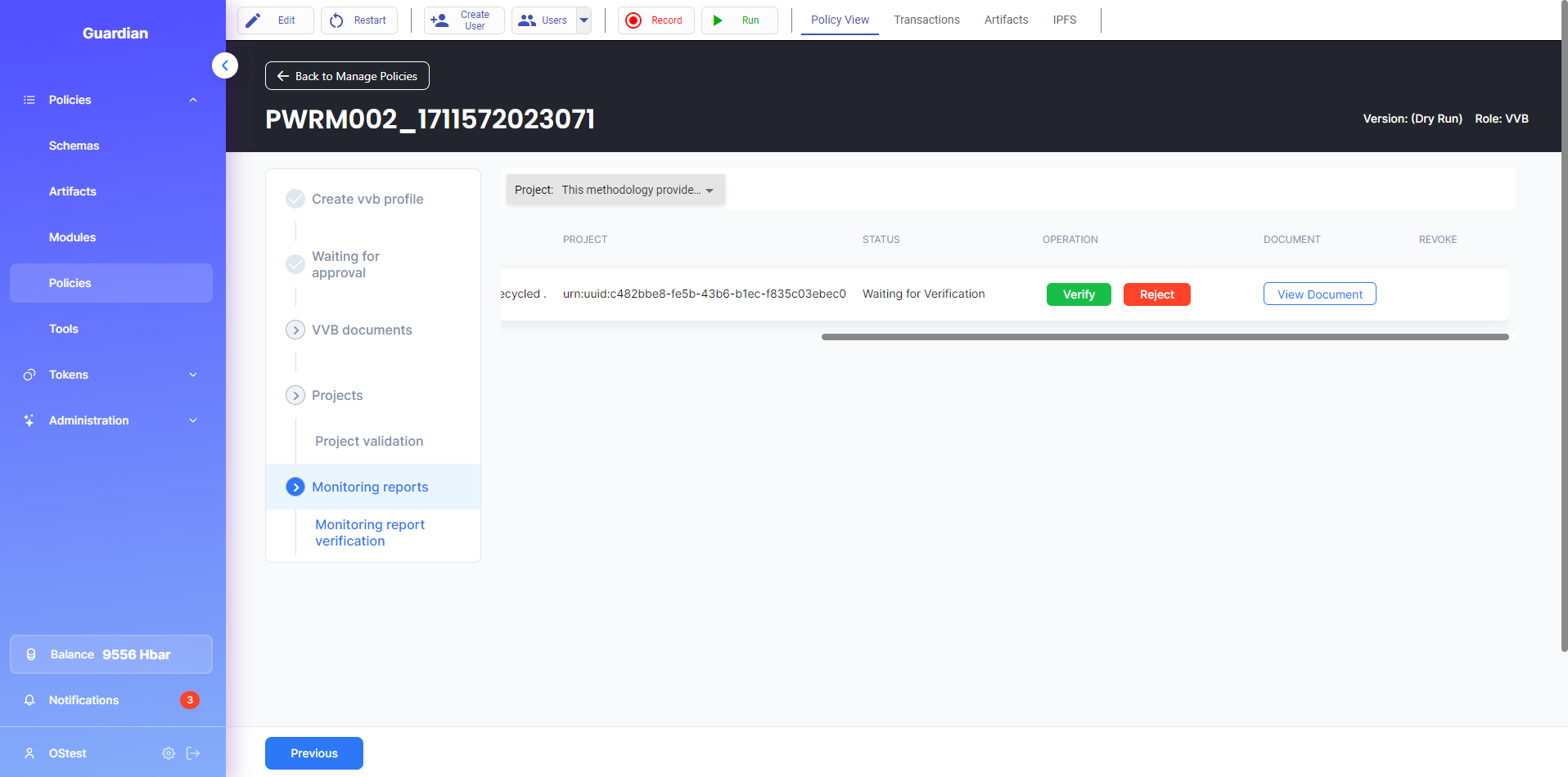 Once the report is submitted, we now log in as the VVB and validate the monitoring report by clicking on the “Verify” button.
