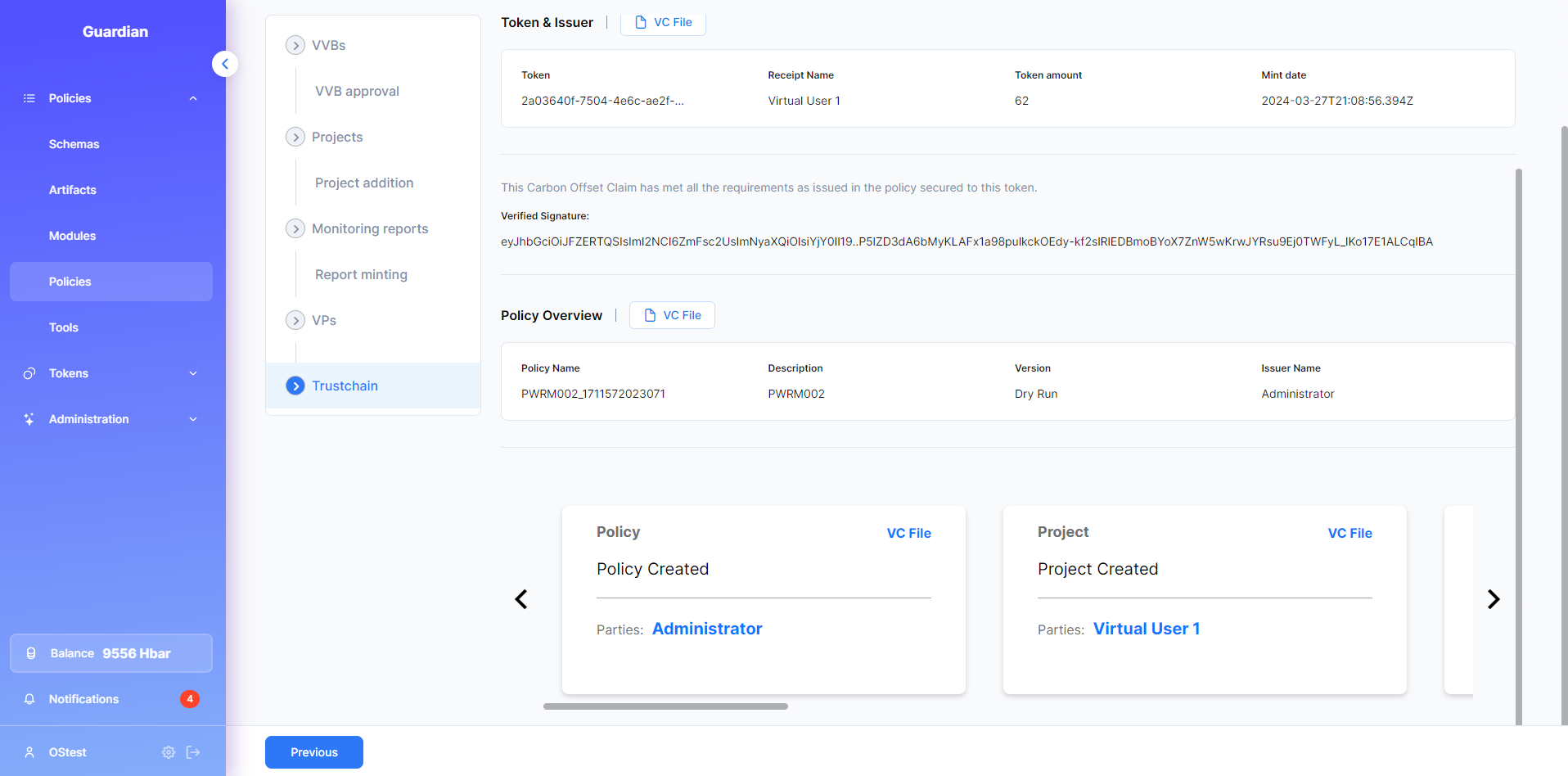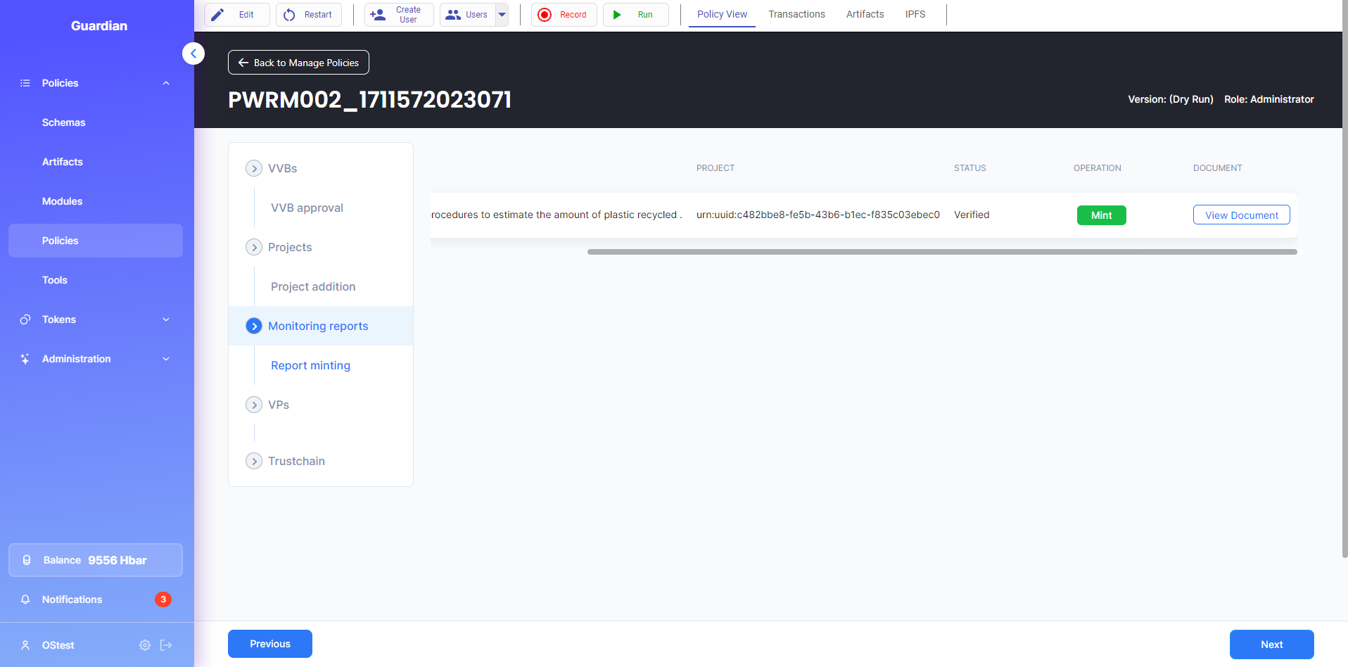 Once the monitoring report is validated, we log in as the SR and click on “Mint” to mint the tokens.