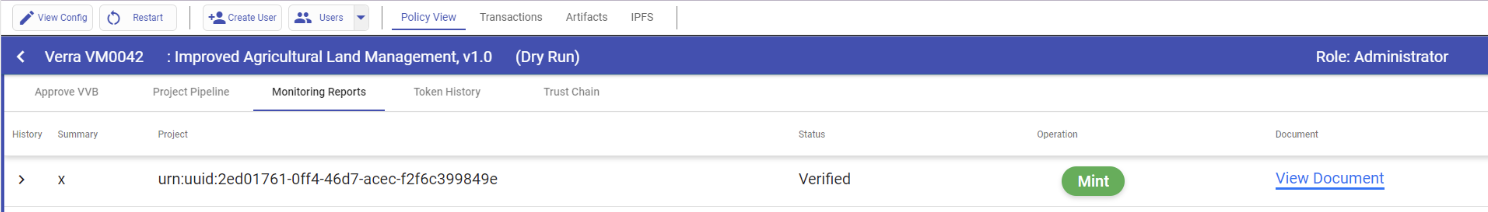 This is the final step in the workflow. Access the Standard Registry profile and navigate to the "Monitoring Reports" tab. Here, you will find a "Mint" button - select that to mint the tokens for this monitoring period.