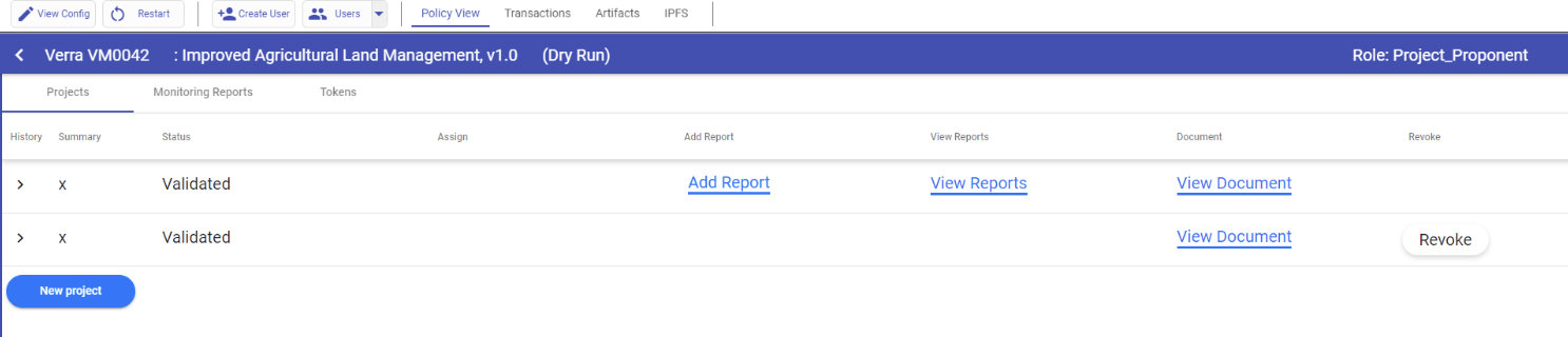 Navigate back to the Project Proponent profile to complete the monitoring report. In the Projects tab select “Add Report”.
