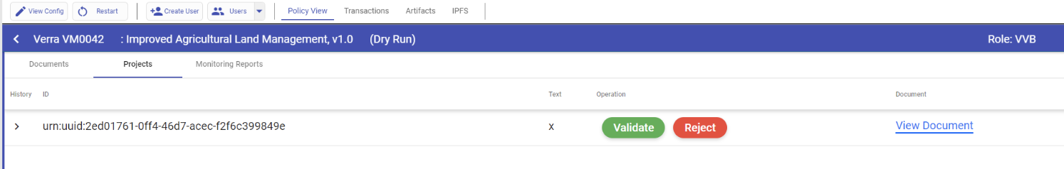 After successfully assigning the VVB to the project, the next step is to access the VVB profile and click on the "validate" option located in the Projects tab.