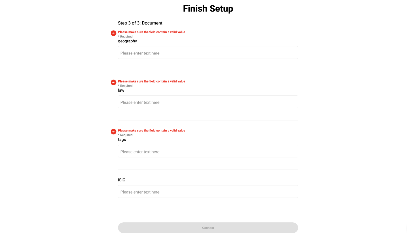 You'll now be prompted to configure your Standard Registry account. Go through the user profile setup screen. At the last step of the user profile screen, Standard Registry users will need to fill out the Standard Registry attribute form (see screenshot below). Press Connect when finished. This will now initialize the Guardian instance on the correct Hedera Consensus Service Topics, create a DID document, create a Verifiable Credential, etc.