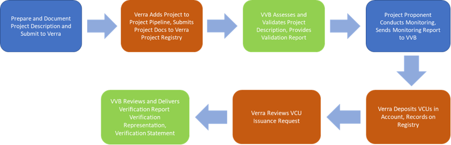 The workflow begins with the Project Proponent submitting the project description (PD) to Verra. The project description will include ex-ante estimates of the monitoring parameters, as well as other project details to demonstrate alignment with the VCS program requirements. Verra then adds the PD and project docs to the Project Pipeline and Project Registry. Next the Validation and Verification Body (VVB) will assess and validate the PD and provide a Validation Report. Then the Project Proponent will conduct monitoring and develop a Monitoring Report, replacing the ex-ante estimates with ex-post MRV data and submit it to the VVB. The VVB then verifies the Monitoring Report and delivers a Verification Report, Verification Representation, and Verification Statement. Finally, Verra reviews the issuance request and VCUs and are issued to the Project Proponent.