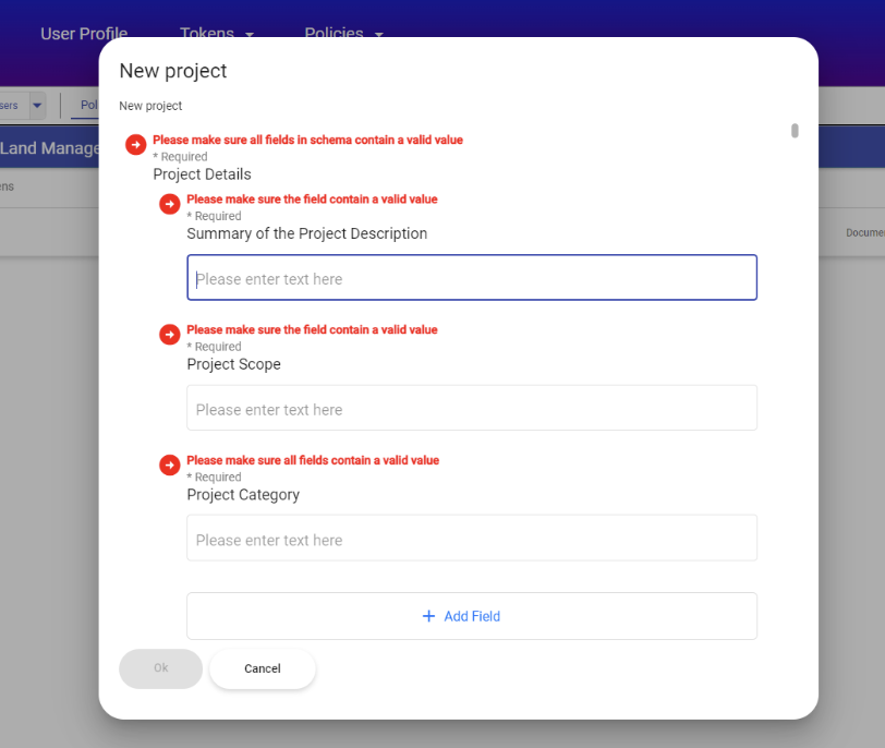 Now, we can input all the project details and data associated with the project in the “New Project” form. In the schema Excel file, if the final CRU calculations do not result in a positive integer, selecting "Ok" after completing the form will trigger errors.