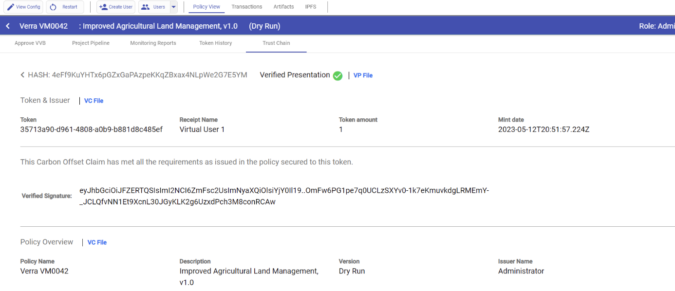 The Trust Chain view presents critical elements that are publicly available for discovery, such as token information, policy information, and all the necessary details concerning the Verifiable Credentials comprising the Verifiable Presentation. On the bottom of the screen, you will find "Cards" showcasing the Verifiable Credentials in chronological order.