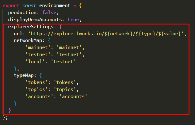 To make changes in the Explorer, we need to change some parameters in environment settings on UI. explorerSettings, which contains url (with network, type, value variables) , networkMap, typeMap (networkMap and typeMap helps to resolve api path on different explorers) as shown: