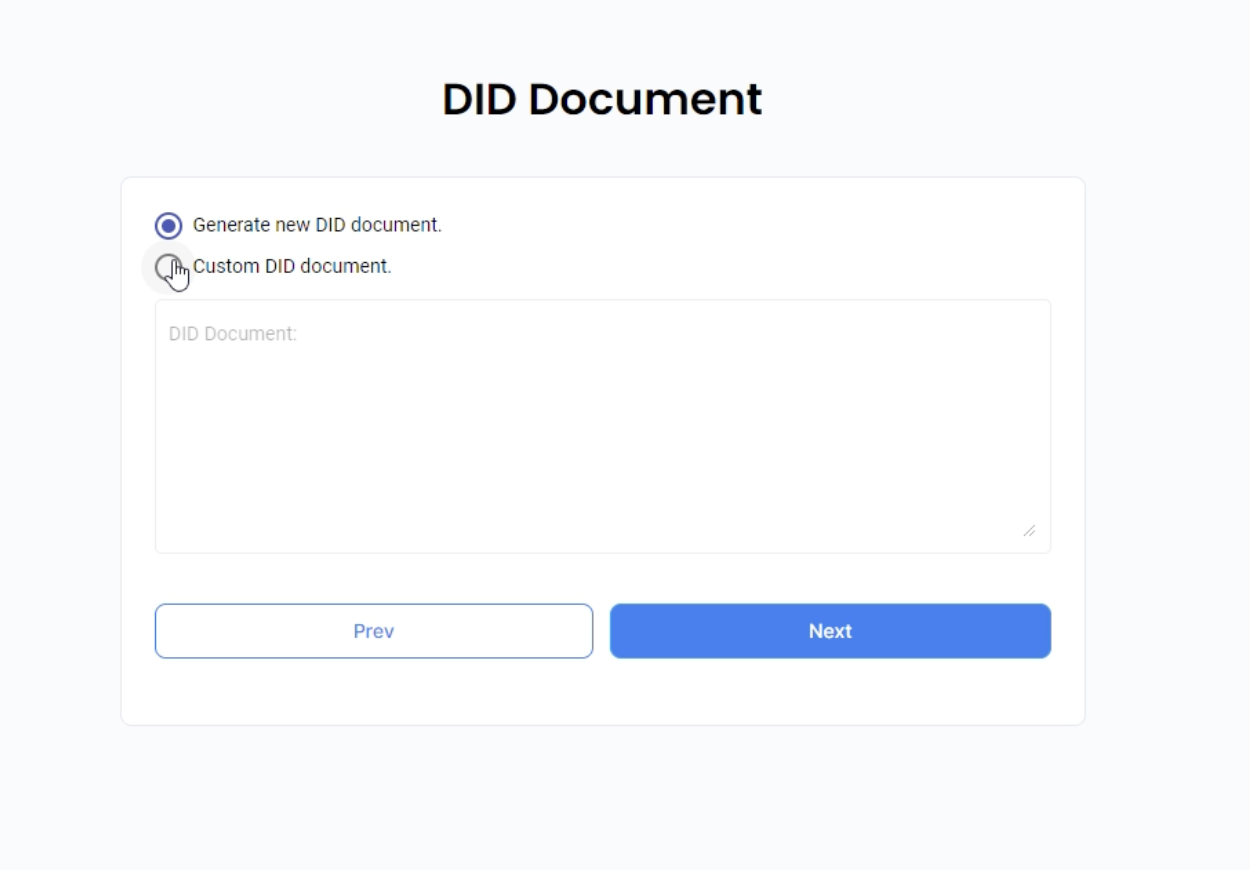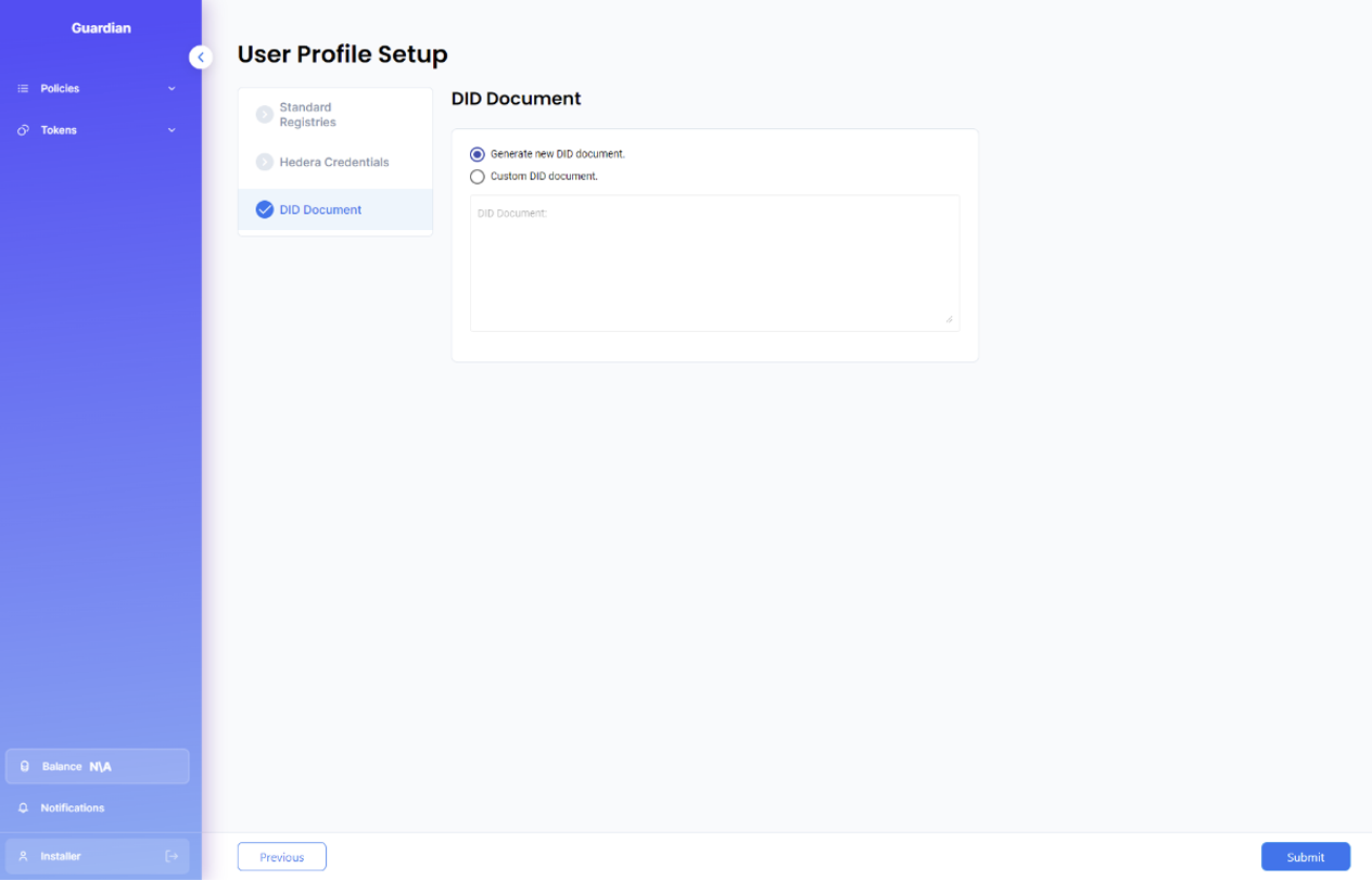 When the ‘Generate new DID document’ option is selected, clicking on the Next button would result in Guardian generating a new dedicated DID to be used exclusively in Guardian based on the Hedera account ID entered at the previous step. Such DID would have the following format:
