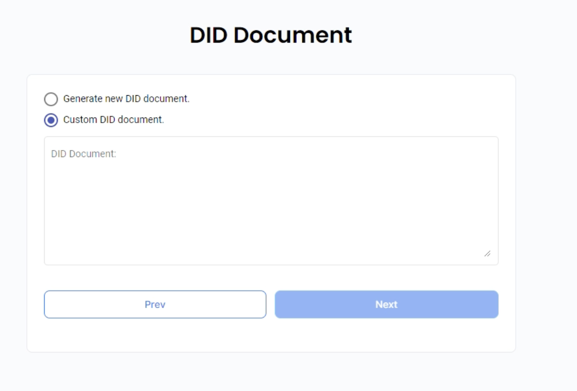 Selecting ‘Custom DID document’ option enables the dialogue text window where the externally-generated/controlled DID document can be pasted from the clip-board. The document must contain Ed25519VerificationKey2018 and Bls12381G2Key2020 verification methods to be useable by Guardian.