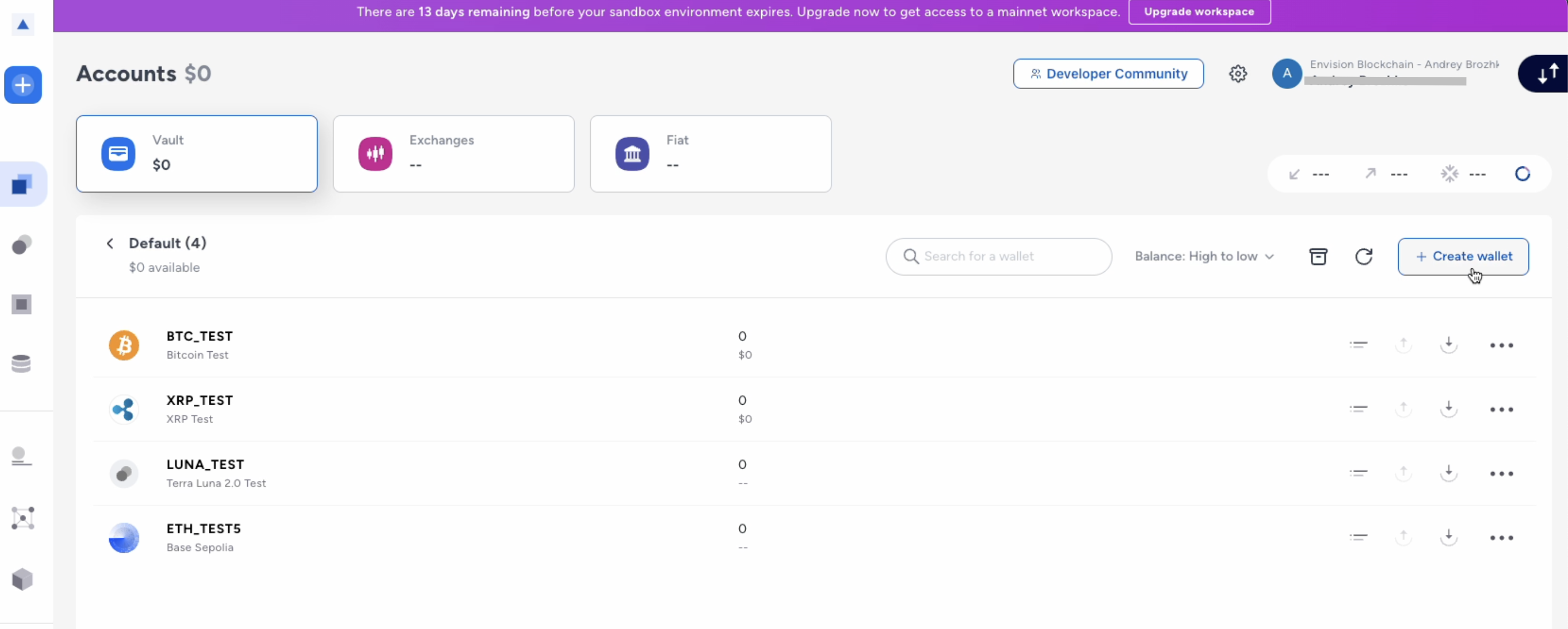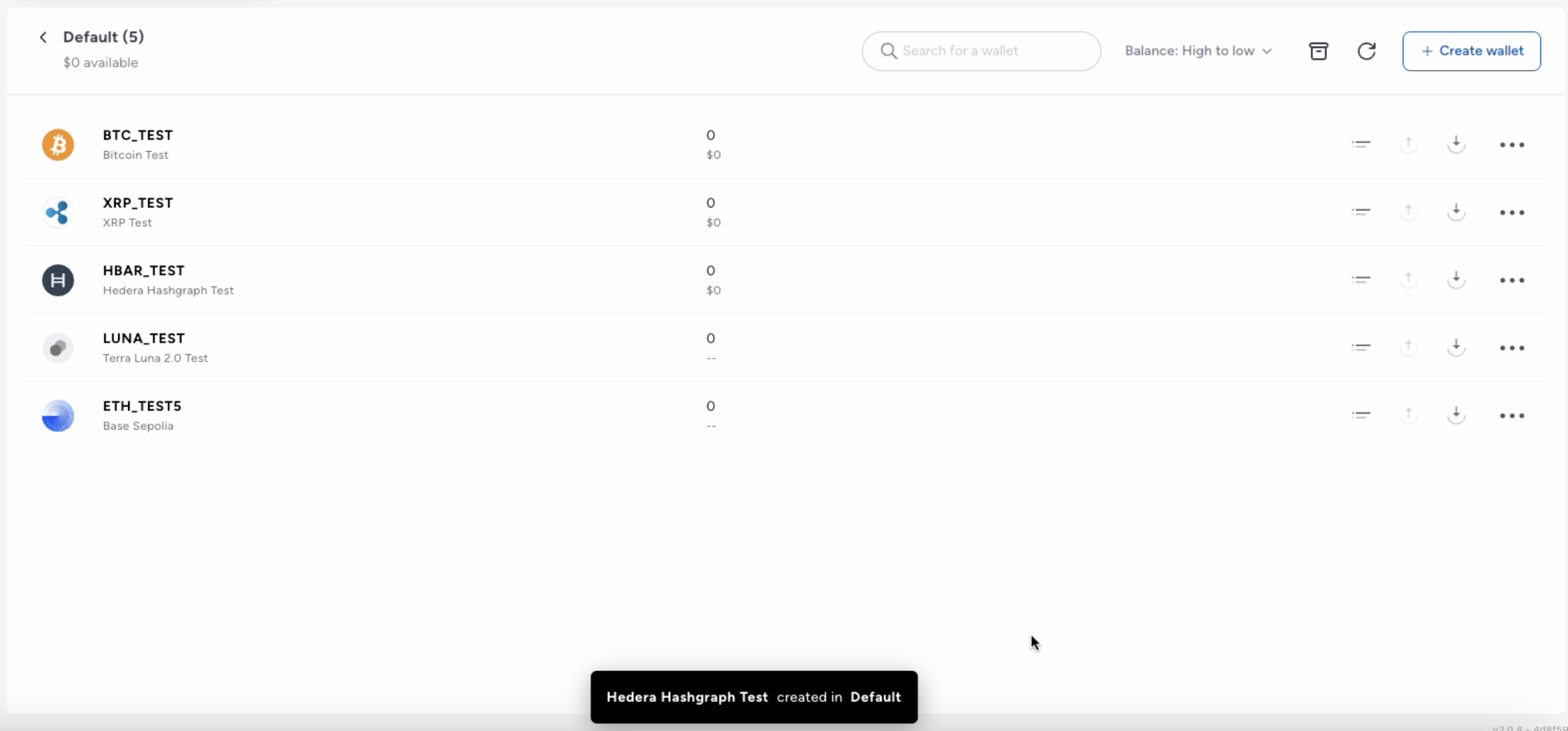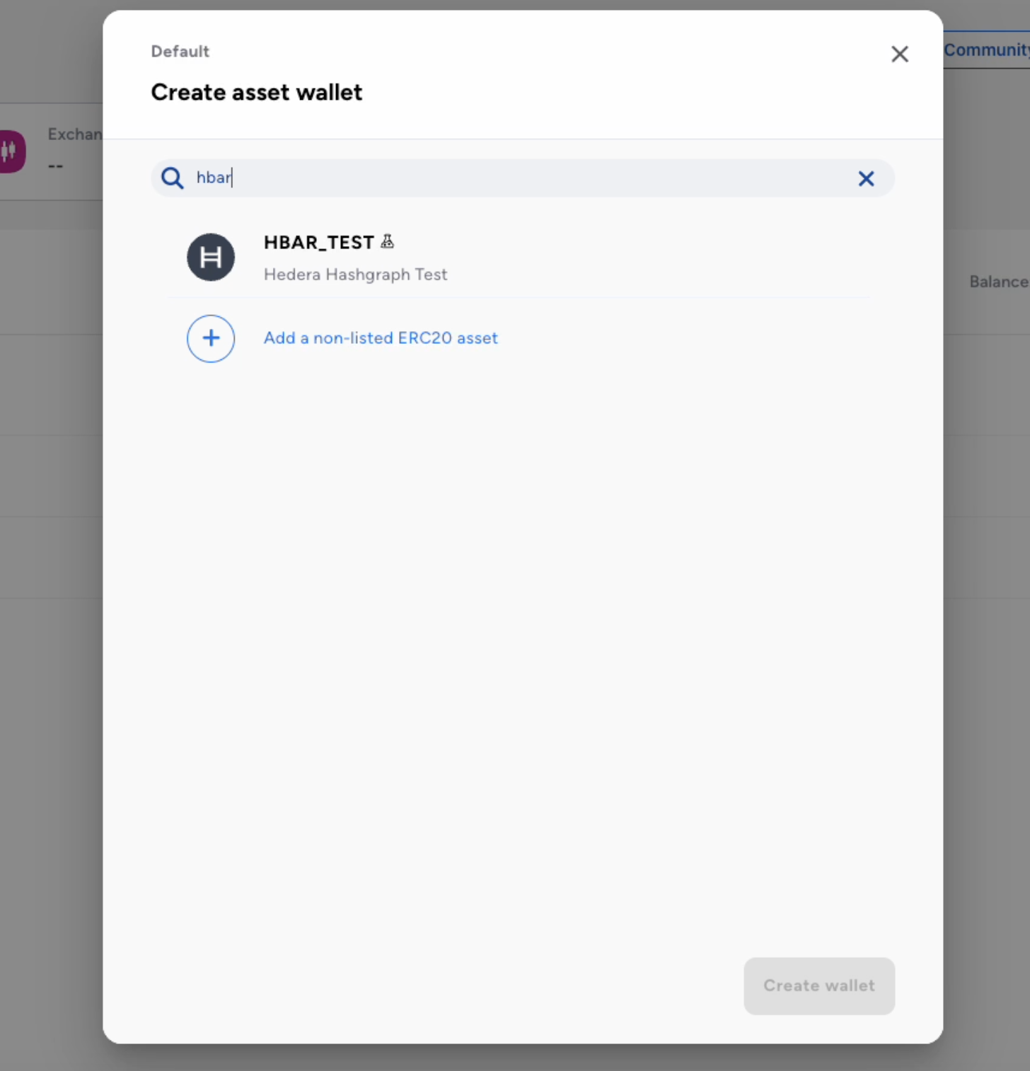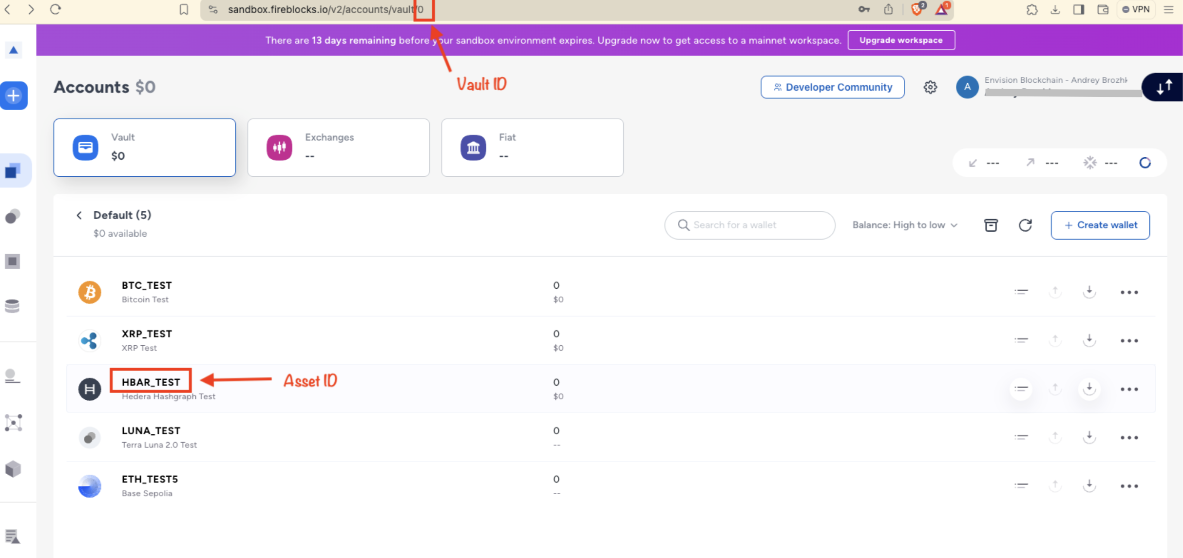 3. In the FireBlocks console navigate to the “Accounts” tab and select one of the accounts listed. Create a wallet for HBAR (mainnet) or HBAR\_TEST (testnet) asset ID. Click on the wallet created, the number in url should be used for the value in the “Fireblocks Vault ID” field, and the asset name chosen is for the “Fireblocks Asset ID” field.