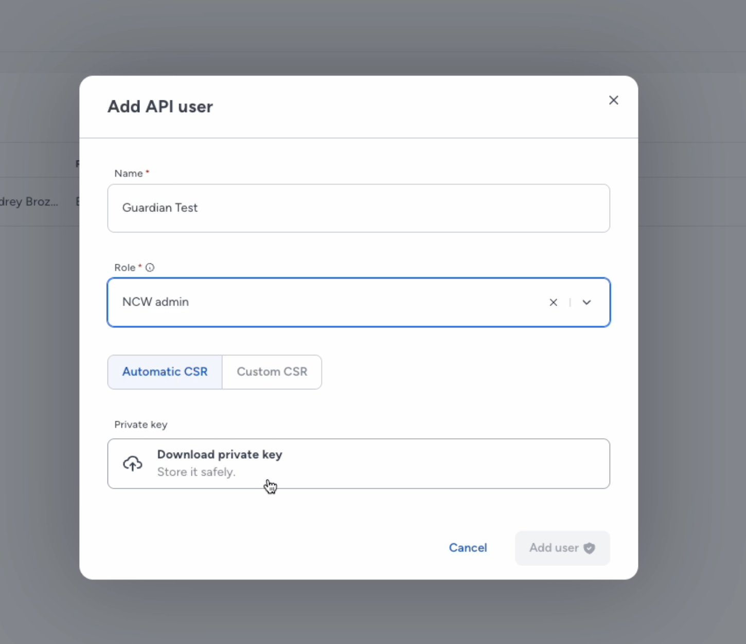 In new API user dialog, you can download Private key file or upload your custom key file.