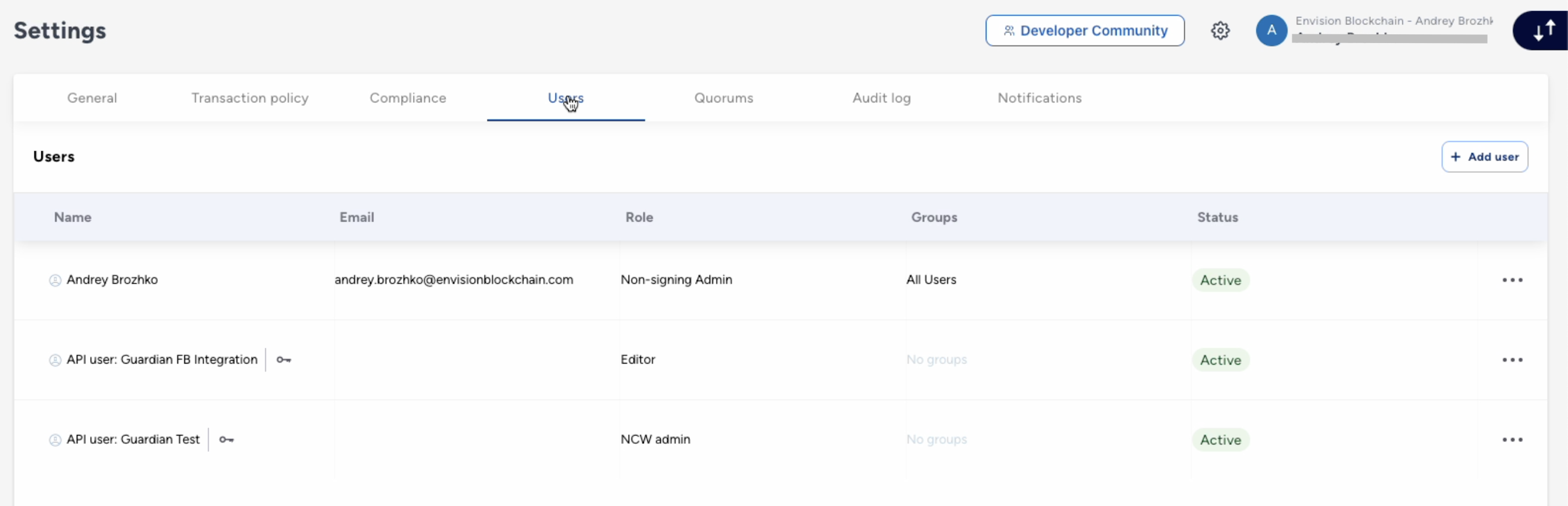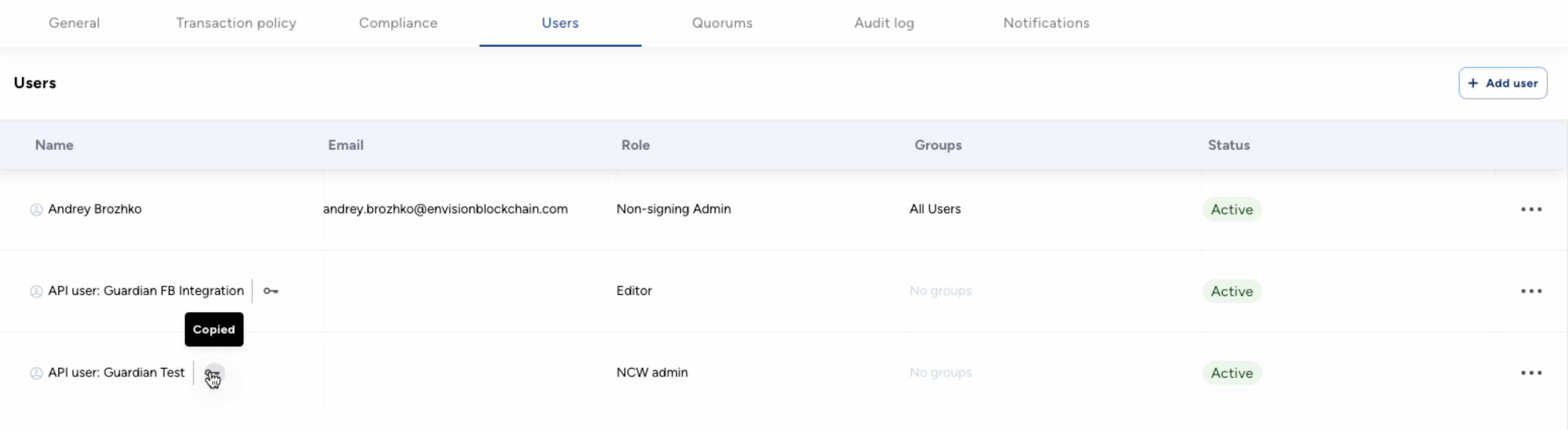 2. When the user was created – click on Settings and then click on the Key icon for the respective user to copy API Key: