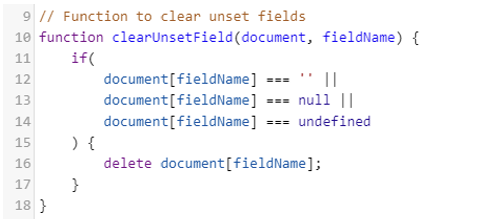 Schema structure does not allow to leave empty fields in the resulting document. If he expression allows for an empty value (for example in the ‘if’ operator) then after the execution of the expression the field needs to be checked for empty value, and deleted if it’s empty. This is done by calling the clearUnsetField function as shown on the example below.