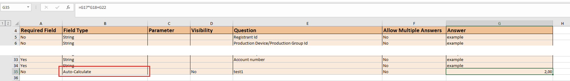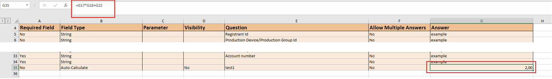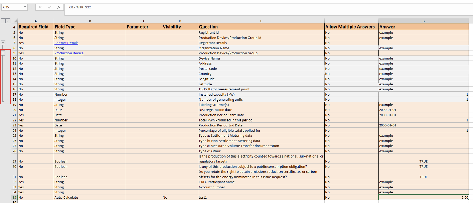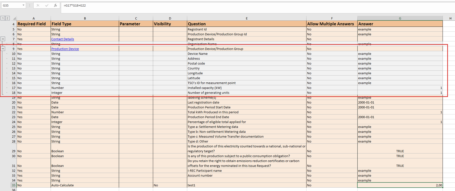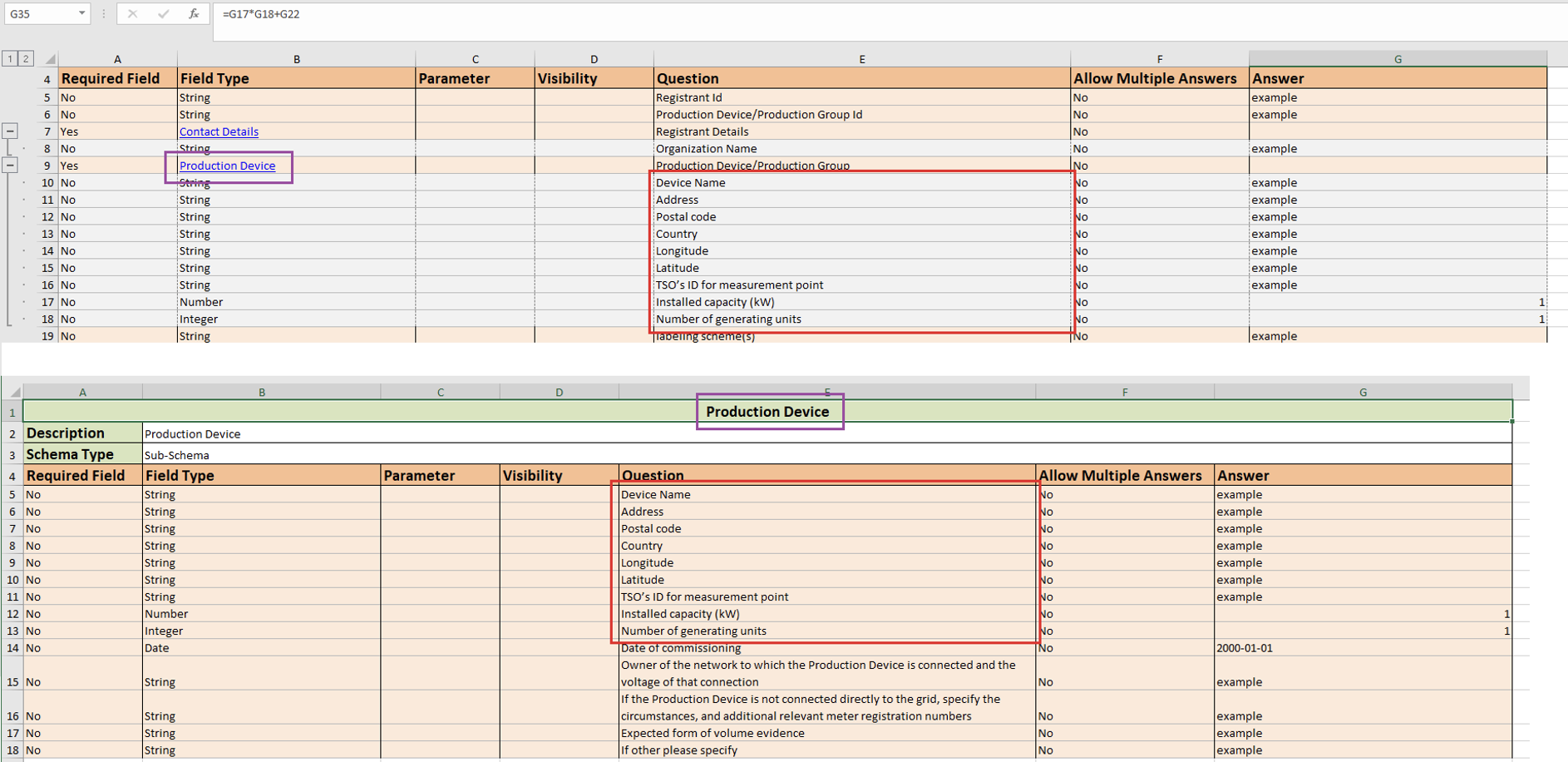 The fields from embedded schema definition tab (e.g. titled as ‘Production Device’ on the screenshot below) and their duplicates in the parent schema where they used for calculations expression must be identical at all times as best observed via values in the ‘Question' column.'
