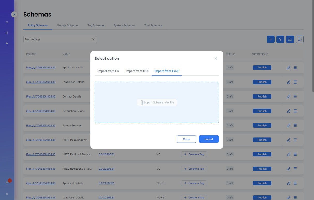The ‘Import/Export schemas from/to Excel’ UI menu options trigger the process of seamless transformation of schemas written in Excel into valid Guardian JSON schemas, and vice versa. The content of such schema excel files must conform to the format presented in the template accessible via the corresponding button on the 'Policy Schemas’ page. The menu options for actioning Import and Export are accessible via the ‘Manage Policies’ and ‘Policy Schemas’ pages.