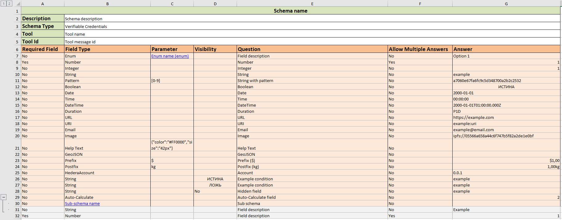 * **Sub-schema name** – the name of the embedded schema (or the name of the tag in the spreadsheet)