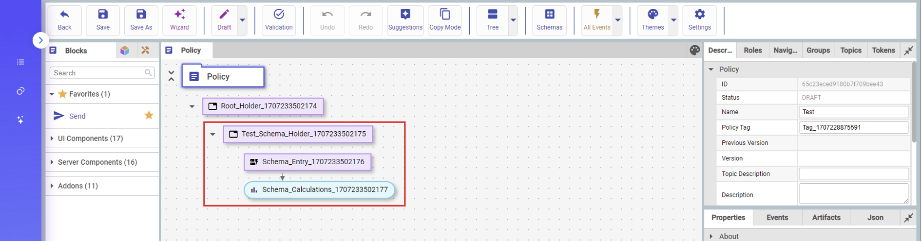 Importing schemas into a Guardian policy will result in a number of new autogenerated blocks appearing in the beginning of the policy flow which ‘hold’ each imported schema and its tool or form as shown in the screenshot below.