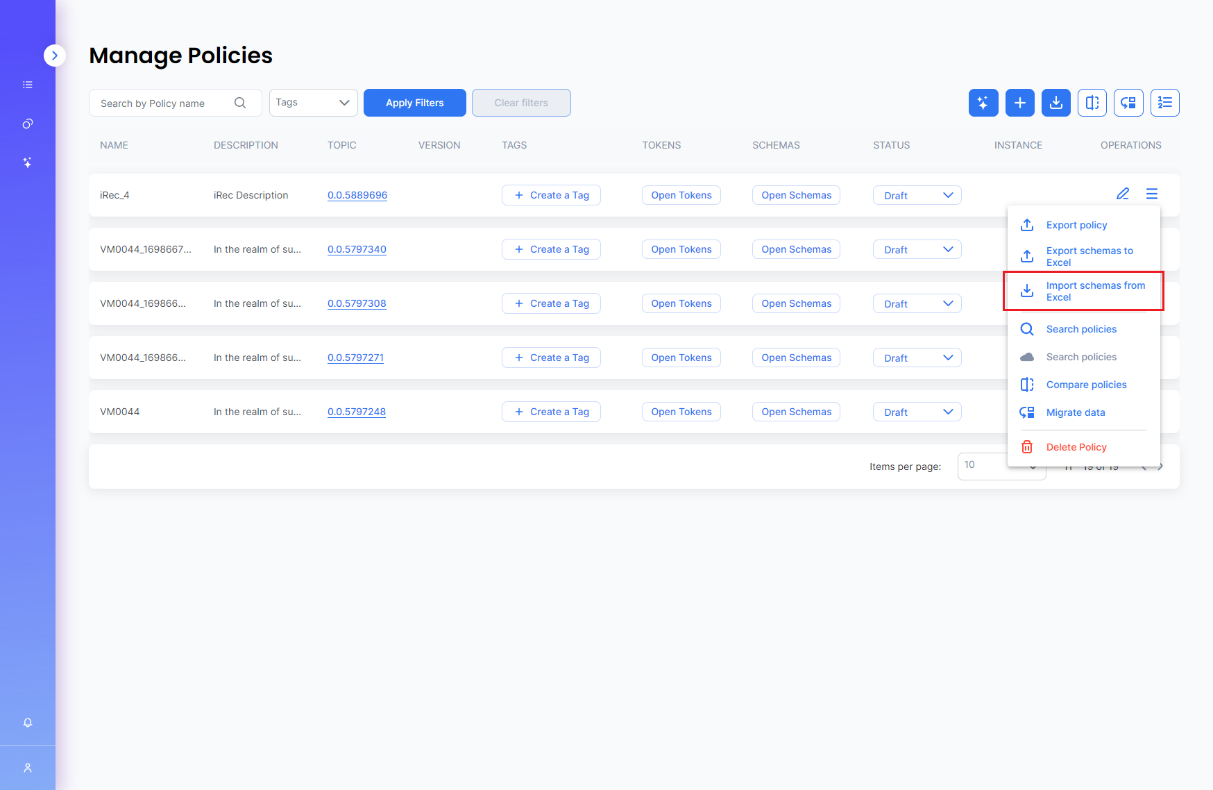 Use the corresponding menu option : **Import schemas from Excel** in the Manage Policies or Policy Schemas pages.