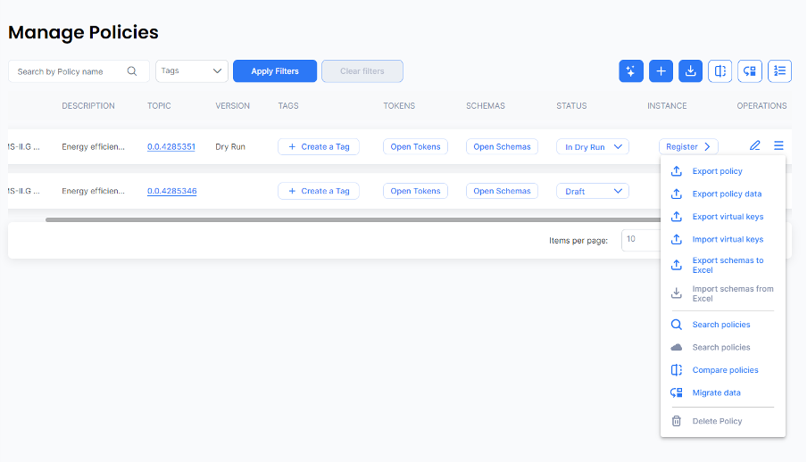 To export/import virtual users’ keys and DID documents for dry-run policies press the corresponding ‘**Export virtual keys**’ or ‘**Import virtual keys**’ menu options.