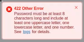 When changing a password or creating a new user, if the password doesn’t meet the policy requirements, the backend will return a 422 error and the frontend will display a notification stating that the password does not comply with the password policy.