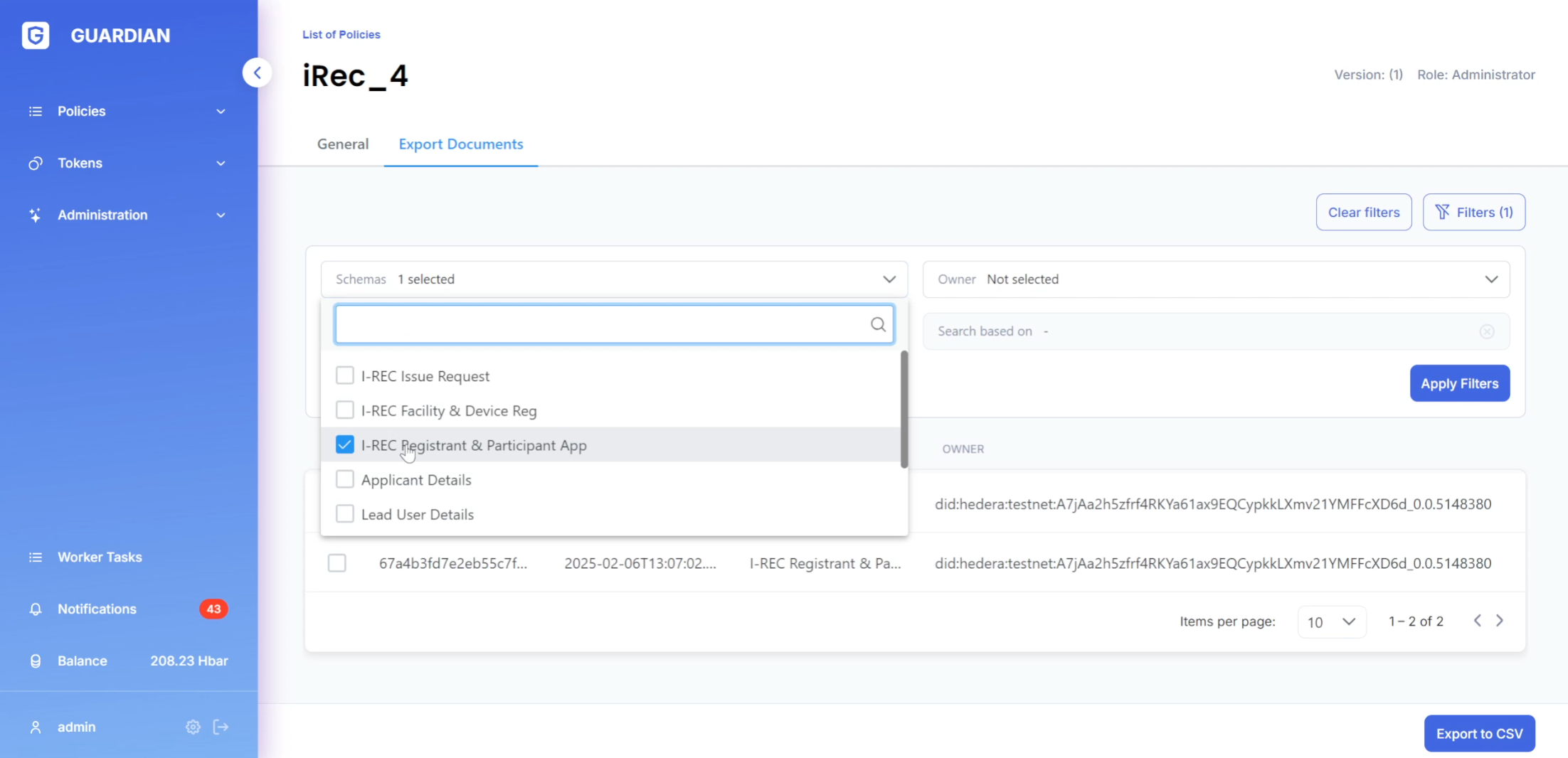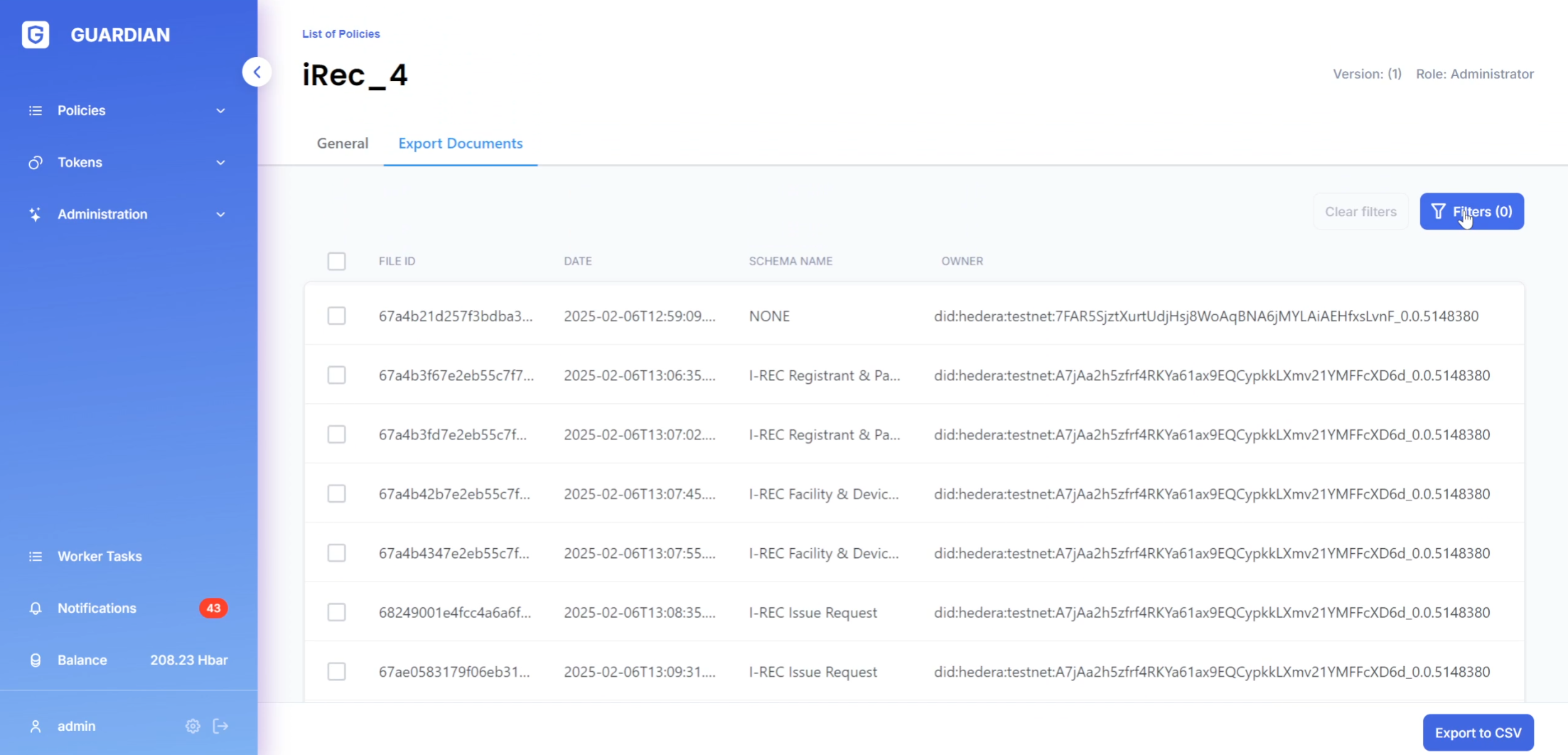 * Clicking the **"Export to CSV"** button downloads all documents currently shown in the filtered view.