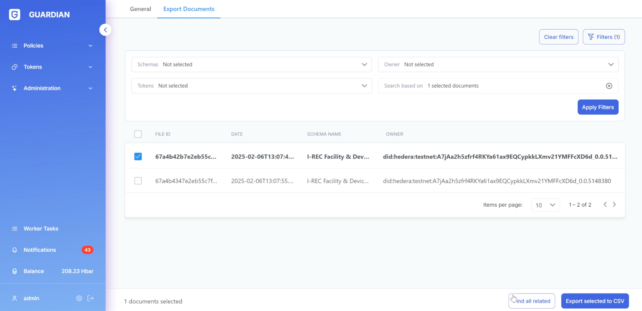 * Filters include schemes, owners (for the **SR** role), tokens, and related documents.