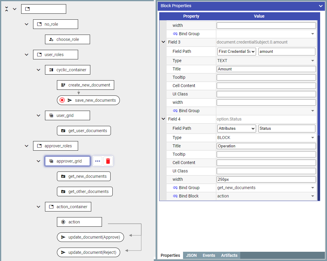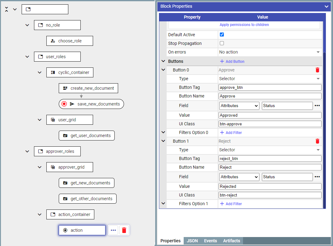 To enable actions (in this example ‘Approve’ and ‘Reject’) the ‘buttonBlock’ block is used.