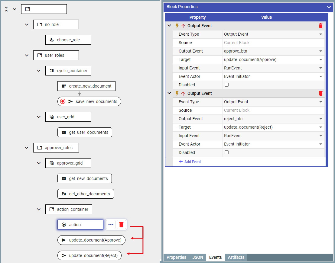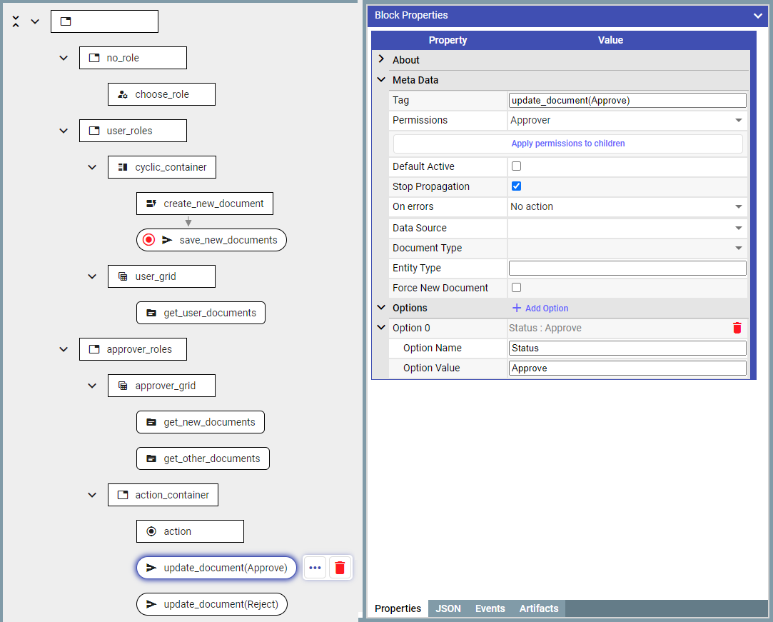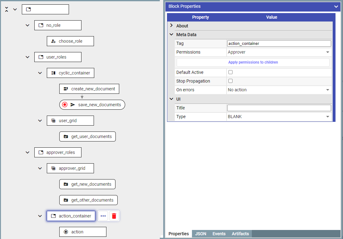 Assign these containers to appropriate Permissions: ‘no_role’, ‘User’, or ‘Approver’, and add the first containers into the RoleSelectionBlock.