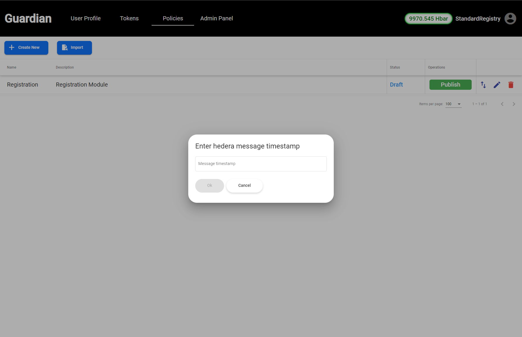 Modules can be created via the Modules management page in the Guardian UI by clicking on **Create New** button as shown below: