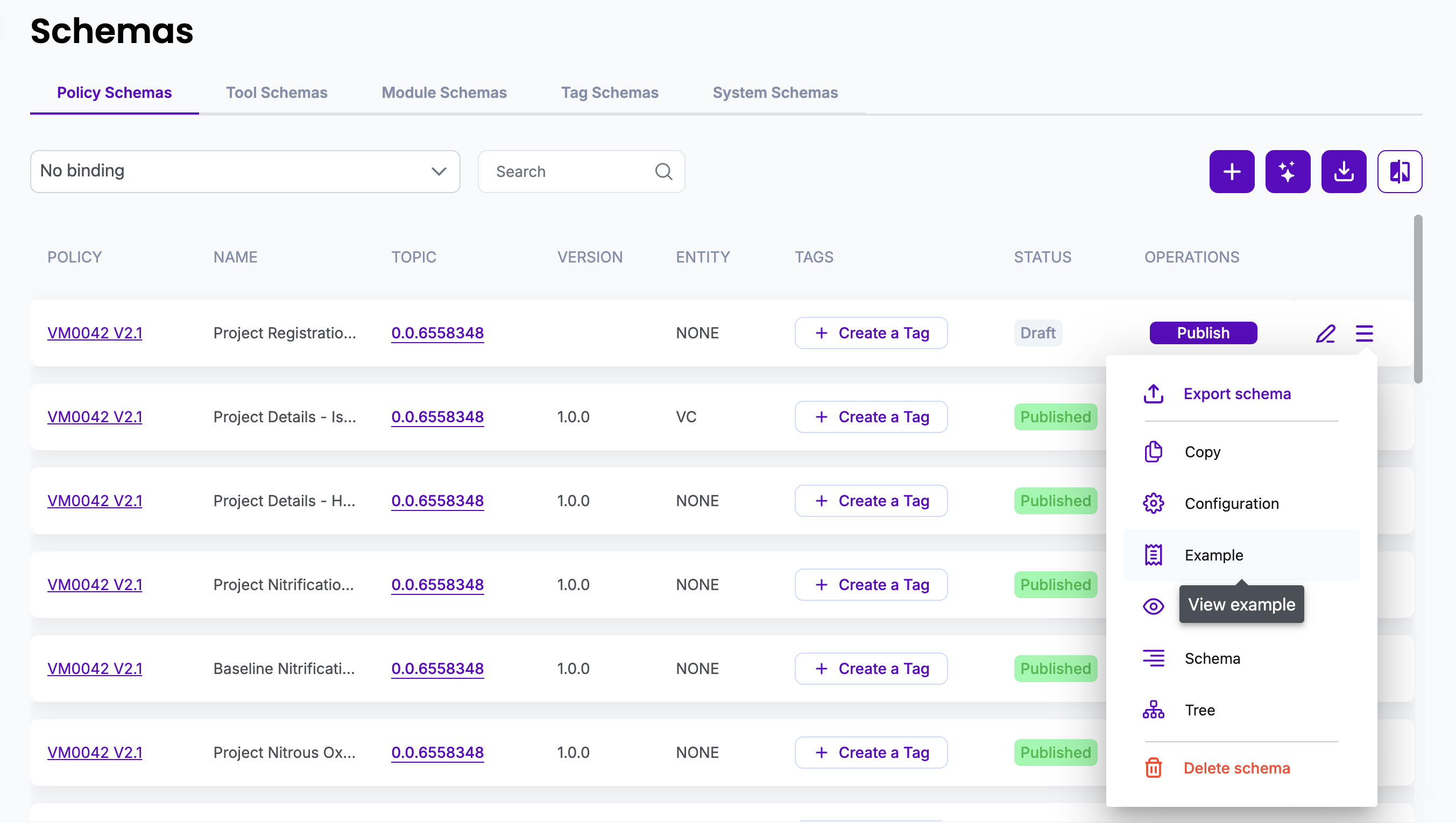 1. **Example:** To add example values to a schema, we need to click on "Example" option as shown below: