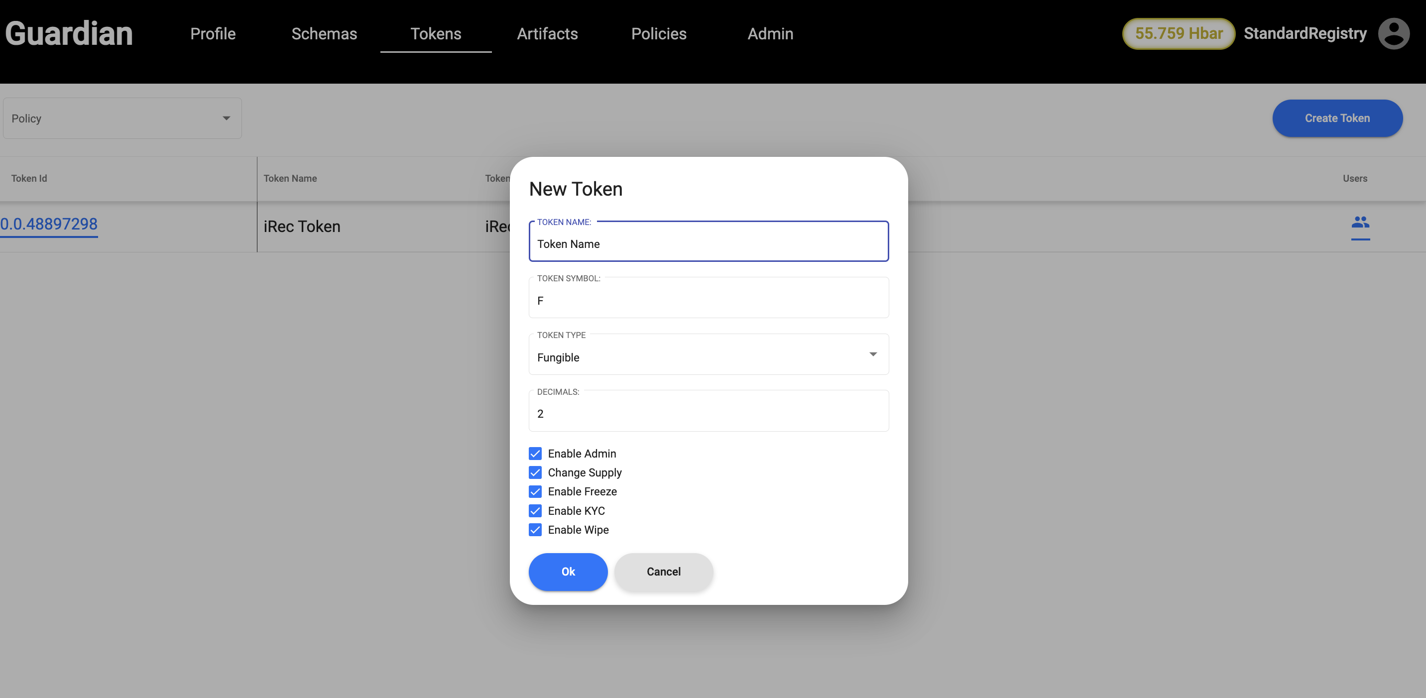 <table><thead><tr><th width="198.66666666666666">Field Name</th><th>Description</th><th>Example</th></tr></thead><tbody><tr><td>Token Name</td><td>Name of the token</td><td>iREC Token</td></tr><tr><td>Token Symbol</td><td>Symbol of the token</td><td>I</td></tr><tr><td>Token Type</td><td>whether the token to be fungible and non fungible</td><td>F/N</td></tr><tr><td>Decimals</td><td>Decimals to be allowed to the token</td><td>2</td></tr><tr><td>Enable Admin</td><td>Enabled to make changes in the token settings even after creating token</td><td>Checked or Unchecked</td></tr><tr><td>Change Supply</td><td>Enabled to change the token supply</td><td>Checked or Unchecked</td></tr><tr><td>Enable Freeze</td><td>Enabling Freezing of the token</td><td>Checked or Unchecked</td></tr><tr><td>Enable KYC</td><td>Enabling KYC when token is created</td><td>Checked or Unchecked</td></tr><tr><td>Enable Wipe</td><td>Enabled to wipe the token supply</td><td>Checked or Unchecked</td></tr></tbody></table>