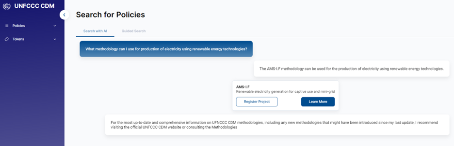 Every response contains text and may include tiles with methodology data if the language model identifies relevant methodologies to suggest. Each tile comprises the policy name, a short description, and two links: as shown below:
